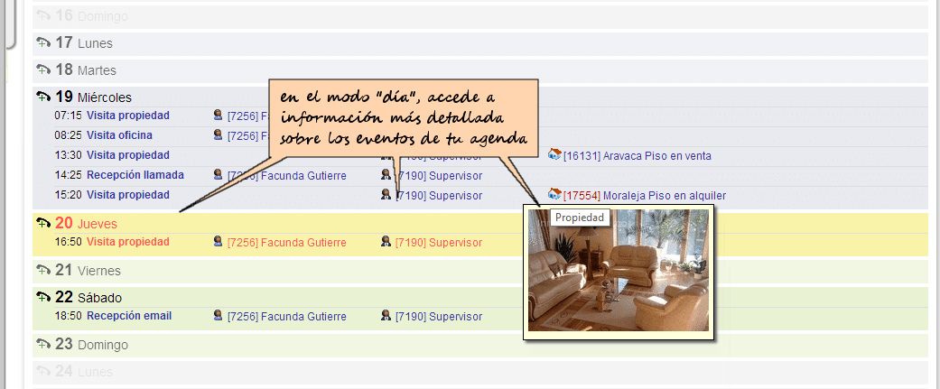 Lleva un control exhaustivo de las acciones comerciales realizadas en tu actividad diaria, tales como visitas de clientes a la oficina, visitas a propiedades, reuniones, llamadas, etc. Además, en modo "supervisor", la agenda te ofrece una visión global de las acciones planificadas y realizadas a nivel global, para que puedas efectuar de manera sencilla un seguimiento y control de la actividad de cada uno de tus agentes.