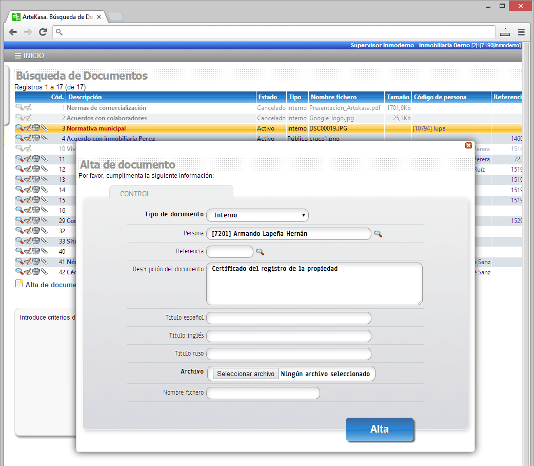 Con el sistema de Gestión Documental de Artekasa puedes registrar documentos de todo tipo, asociados a clientes y/o propiedades y públicos (memorias de calidades, planos, certificados energéticos, etc.) o privados (contratos, condiciones comerciales, etc), así como en distintos formatos.