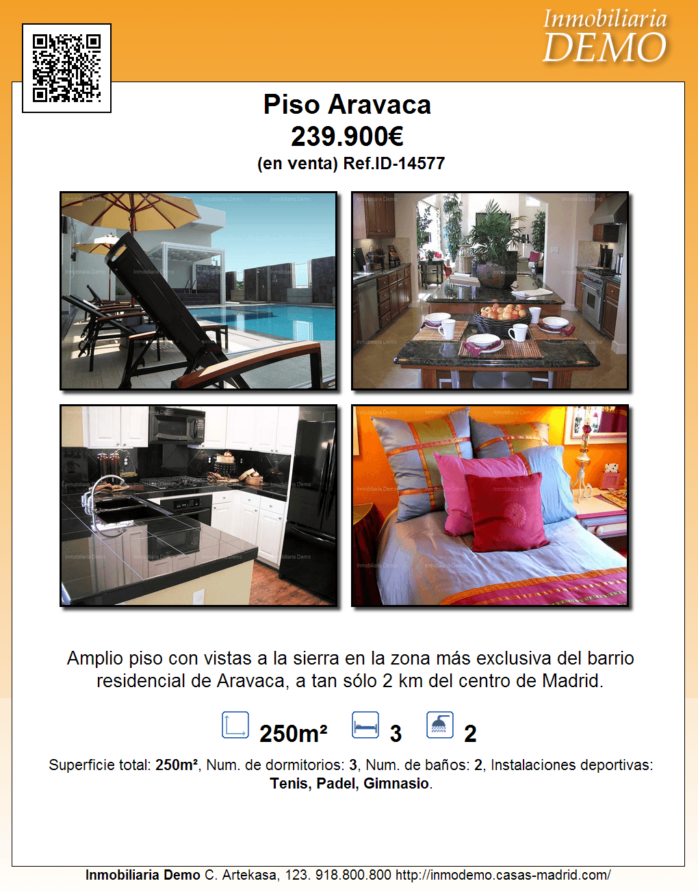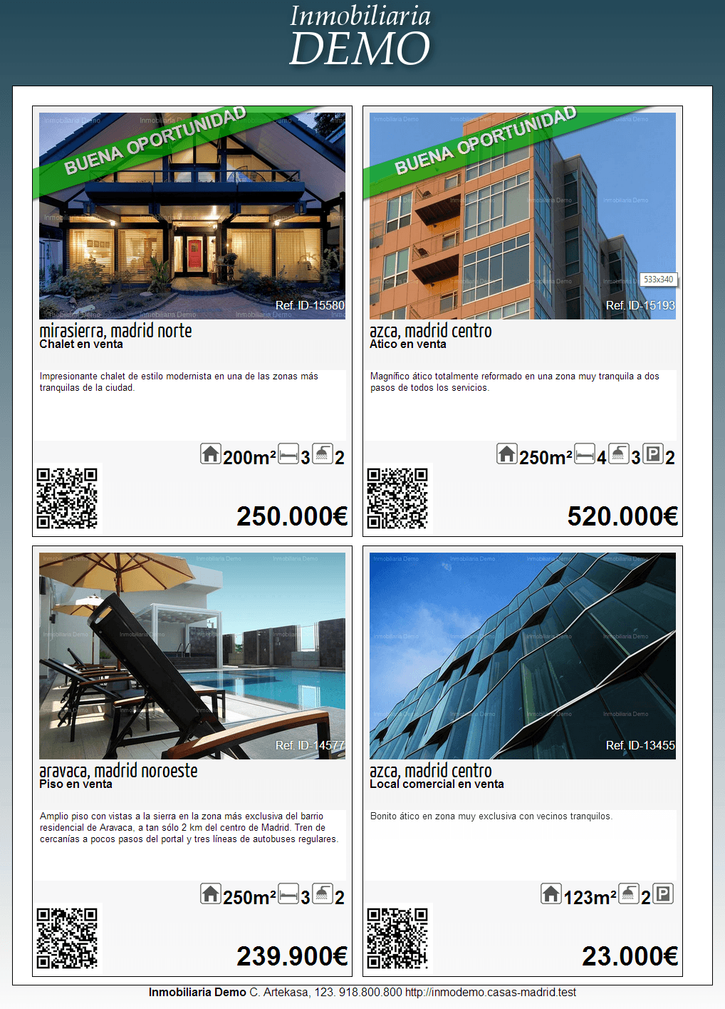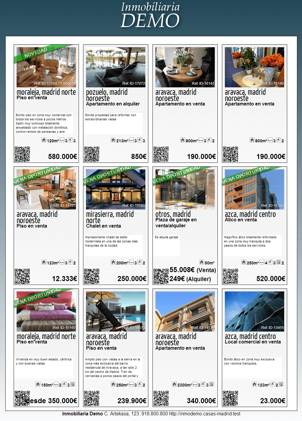 Artekasa permite la impresión de carteles de ofertas de propiedades para colocar en escaparates, vitrinas, etc. Los visitantes de tu web también pueden imprimir los carteles, que incluyen tu logotipo, domicilio, e información de contacto, además de códigos QR para el facilitar el acceso a la web desde smartphones.