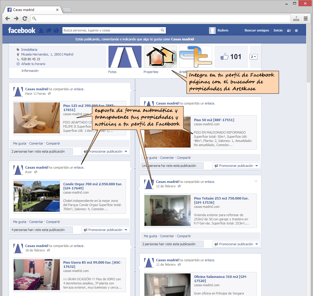 Integra el buscador de propiedades de Artekasa en tus páginas de Facebook, para que los visitantes a tu perfil puedan realizar búsquedas y contactar contigo sin salirse de Facebook.
