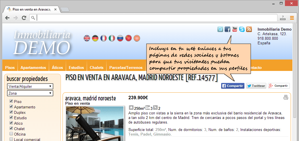 Facilita a tus visitantes que compartan la información de tus propiedades a través de botones "Compartir" en Facebook, Twitter, Google+, LinkedIn, Pinterest, etc.
